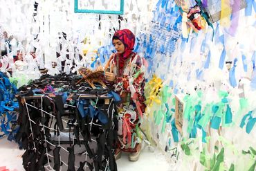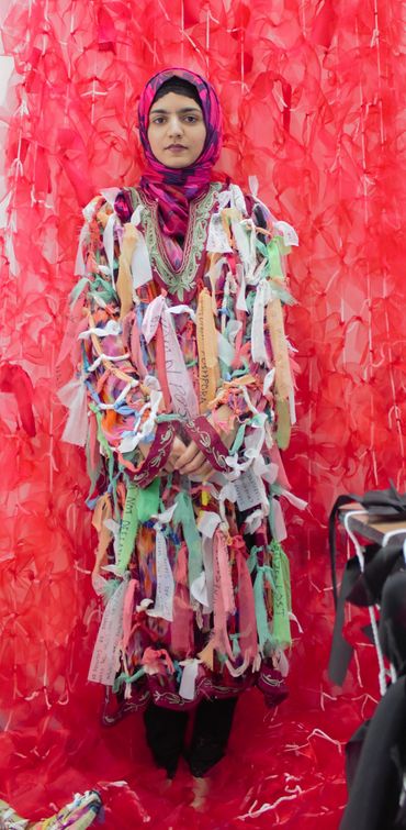 The installation consists of thousands of knots, the condition of psyche- outrage, sadness, love, desire and remembrance. The massive red knots suspended from ceiling flowing downwards. The waterfall turned into bloody red alluding fear of looming violence and is balanced by the landscape, the portrait parts evolved out from knots and the silent persistence of hoping action of knotting and transforming energy to objects. The Performer wearing the Kashmiri garment of knots and performs an on-going simple task of knotting.